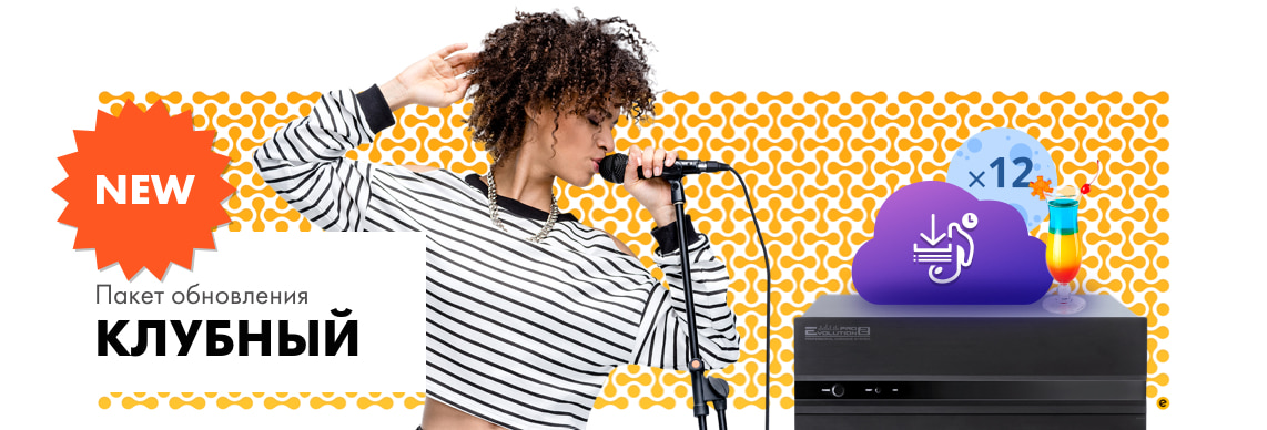 Для заведений с караоке-системой Evolution Pro2 мы создали новый пакет «Клубный»– это лучший пакет для караоке-клубов, идущих в ногу со временем, и посетителей, которые уже давно хотели бы иметь возможность исполнять трендовые песни сразу после их премьеры.