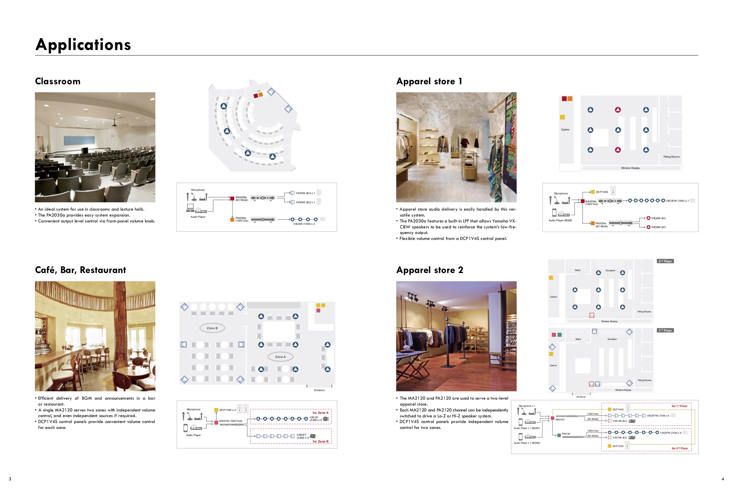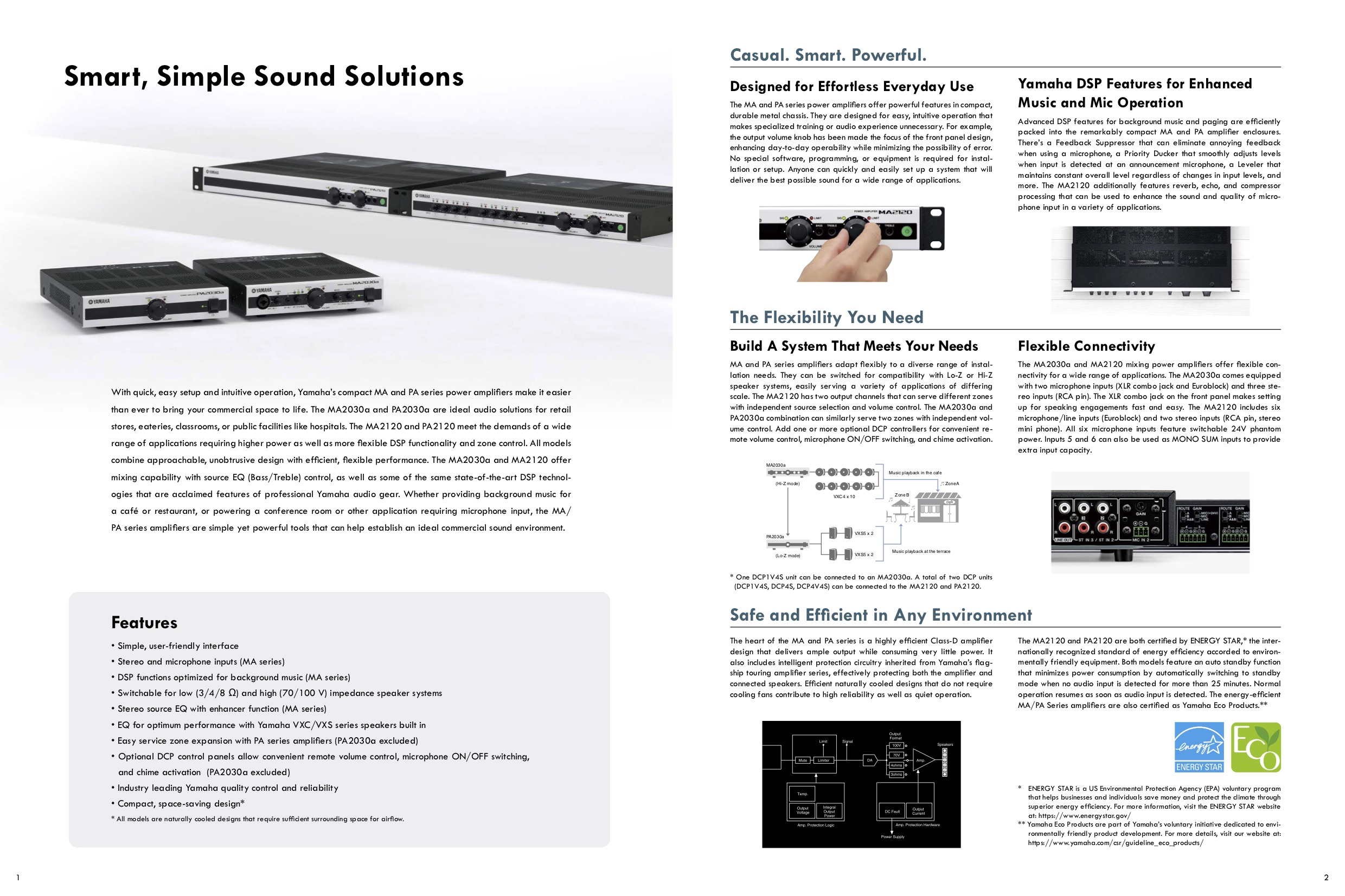 Модели MA2030a и PA2030a идеально подходят для использования в небольших помещениях. MA2030 обеспечивает простоту управления, DSP обработку Yamaha и возможности микширования, достаточные для использования в небольших инсталляциях без необходимости в дополнительном оборудовании