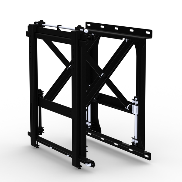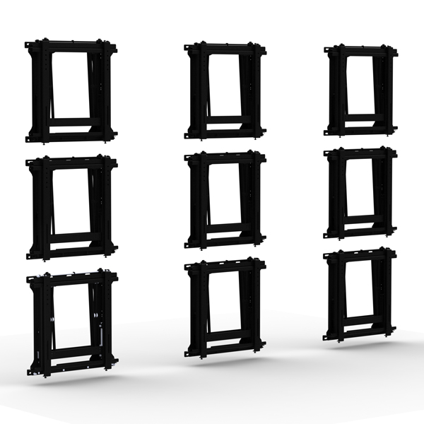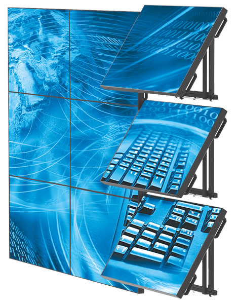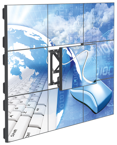 Видеостена представляет собой систему профессиональных ТВ панелей, объединённых между собой с минимальными зазорами (сегодня это всего около 2 мм) в единый экран. К креплениям для таких видеостен выдвигаются особые требования. Ведь очень важным является выравнивание экранов в единую систему. Также немаловажным является функционал креплений, так как для настройки и обслуживания панелей нужен доступ к их задней части. Зачастую, чтоб добраться туда, необходимо демонтировать всю видеостену или ее часть.